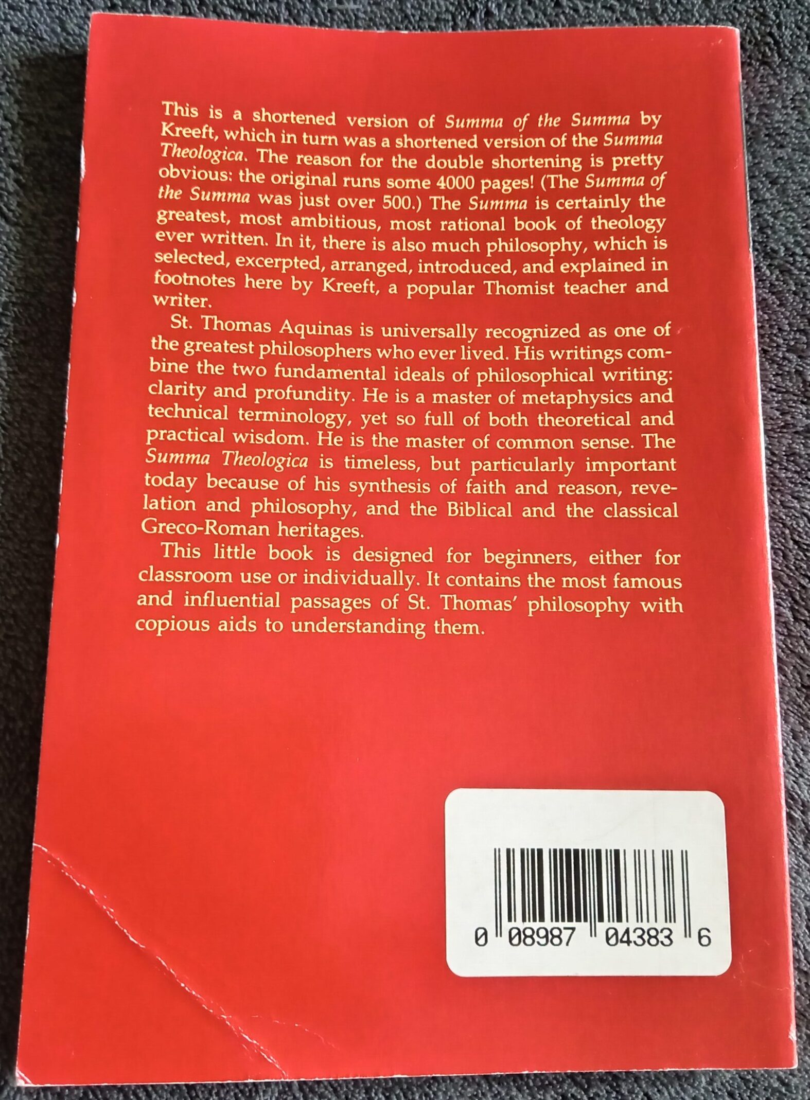 This is a shortened version of Summa of the Summa by Kreeft, which in turn was a shortened version of the Summa Theologica. The reason for the double shortening is pretty obvious: the original runs some 4000 pages! (The Summa of the Summa was just over 500.) The Summa is certainly the greatest, most ambitious, most rational book of theology ever written. In it, there is also much philosophy, which is selected, excerpted, arranged, introduced, and explained in footnotes here by Kreeft, a popular Thomist teacher and writer.