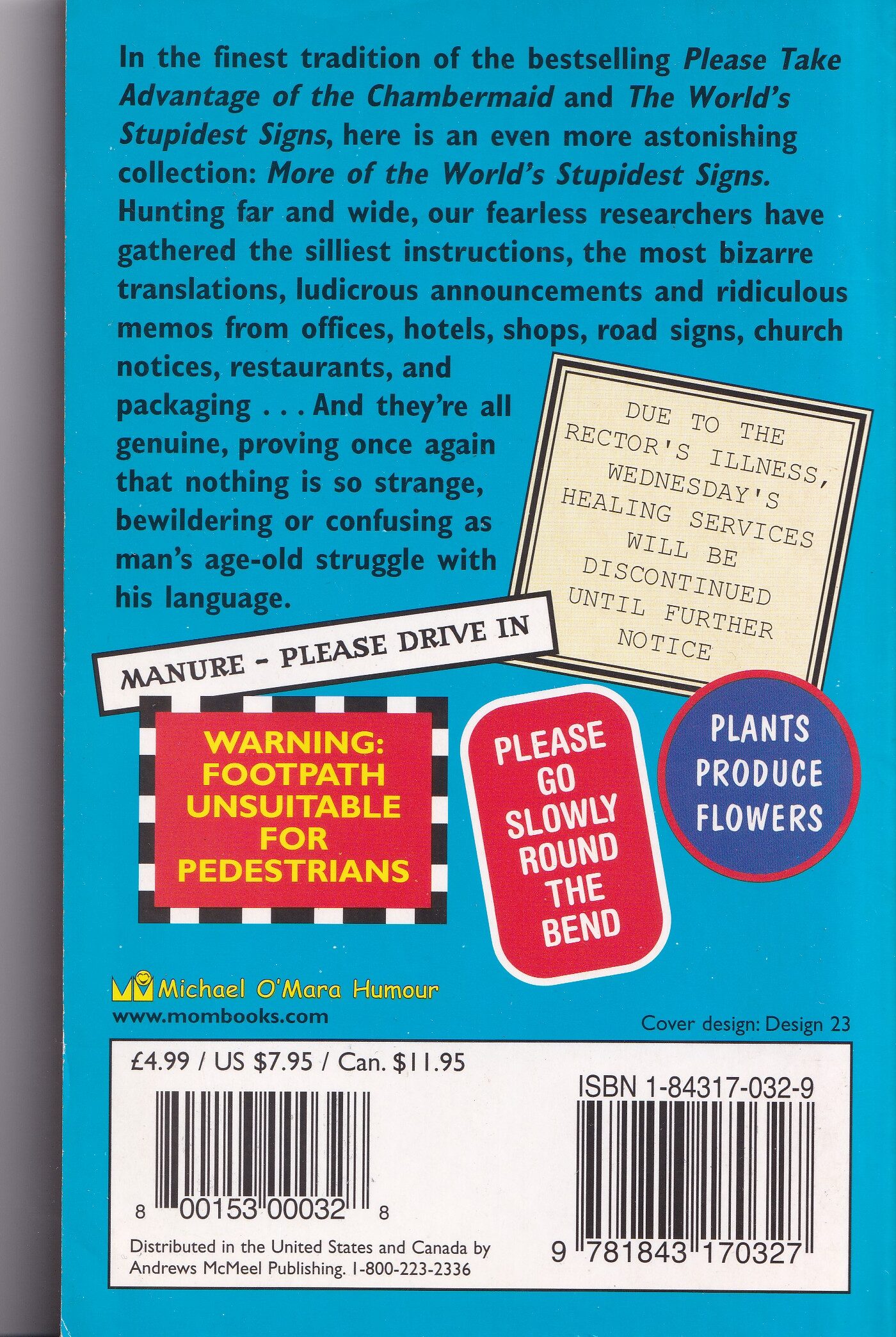 In the finest tradition of the bestselling Please Take Advantage of the Chambermaid and The World’s Stupidest Signs, here is an even more astonishing collection. More of the World’s Stupidest Signs. Hunting far and wide, fearless researchers have gathered the silliest instructions, the most bizarre translations, ludicrous announcements and ridiculous memos from offices, hotels, road signs, church notices, restaurants, and packaging … and they’re all genuine, proving once again that nothing is so strange, bewildering or confusing as man’s age-old struggle with his language.